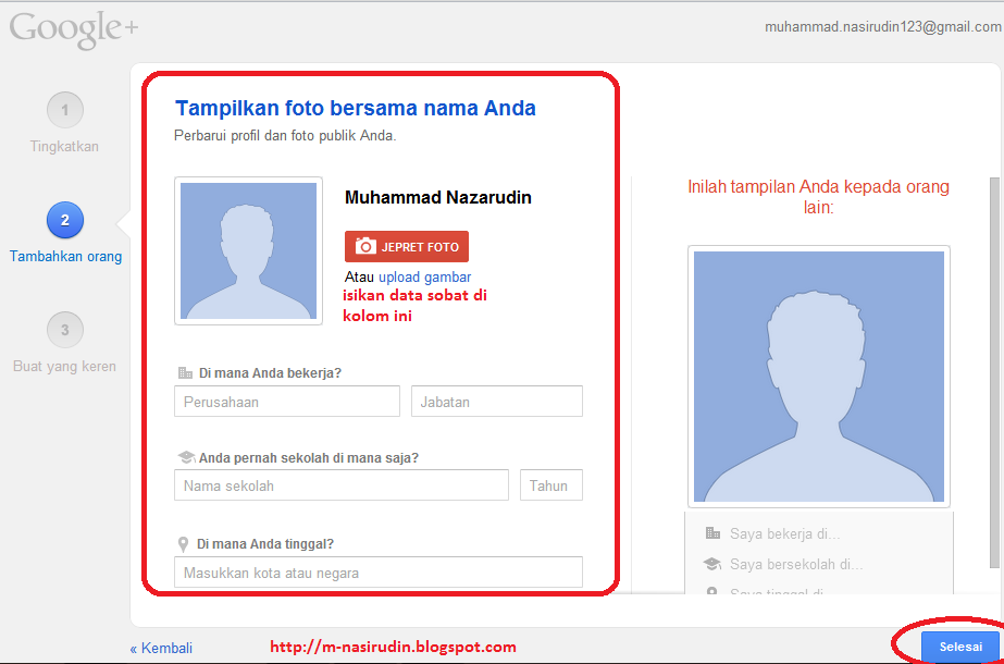 12. Masukkan data dan foto profil sobat, tapi tidak diisipun tidak apa2. Lalu klik Selesai.